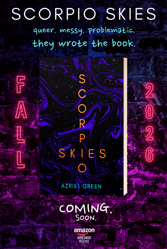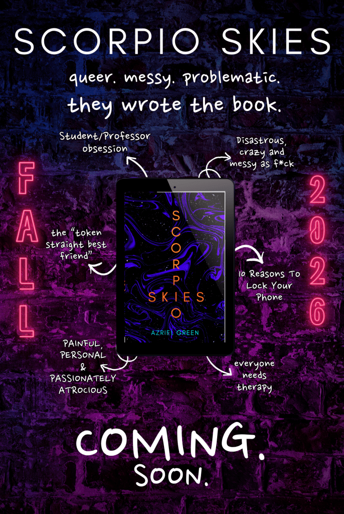 The first of a five book series, Scorpio Skies follows Shane Thackeray on his journey into messy self-discovery after fleeing an abusive long-term relationship and starting over in Crescent Harbour. He quickly realises that his new college professor, Matthew Keane, is certainly about to make waves.